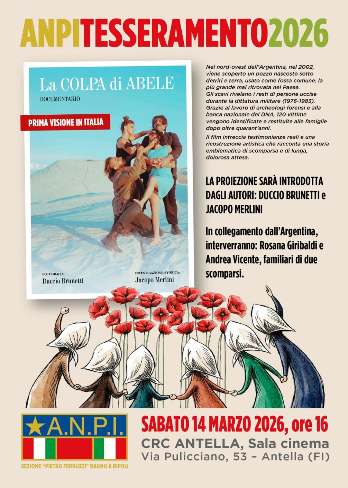 L’ANPI, Associazione Nazionale Partigiani Italiani, organizza l’evento di tesseramento per il 2026 con un pomeriggio al Circolo Ricreativo Culturale di Antella. Domani, sabato 14 Marzo, alle ore 16:00, si terrà la proiezione del film “La colpa di Abele”, documentario proiettato in prima visione in Italia.
