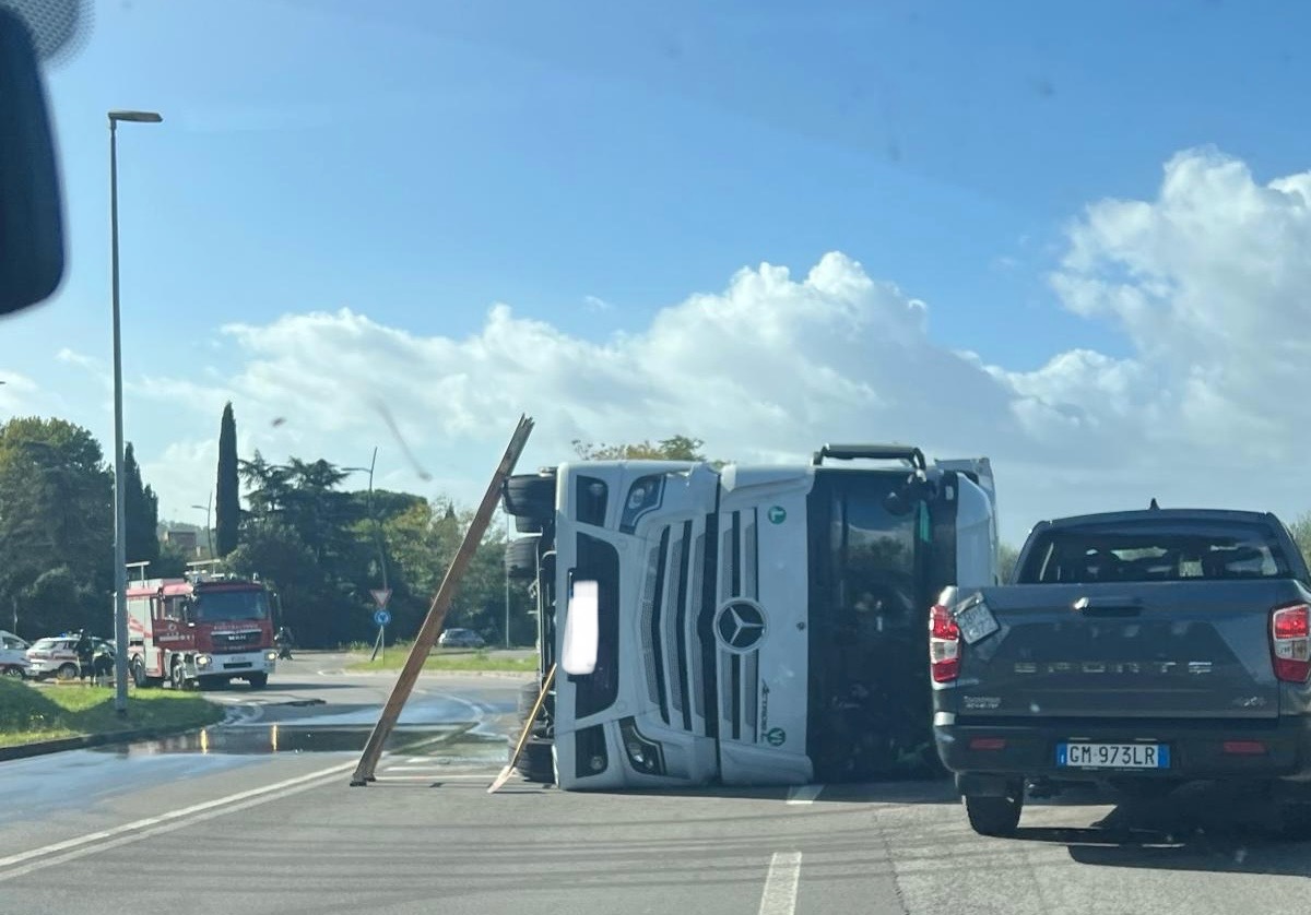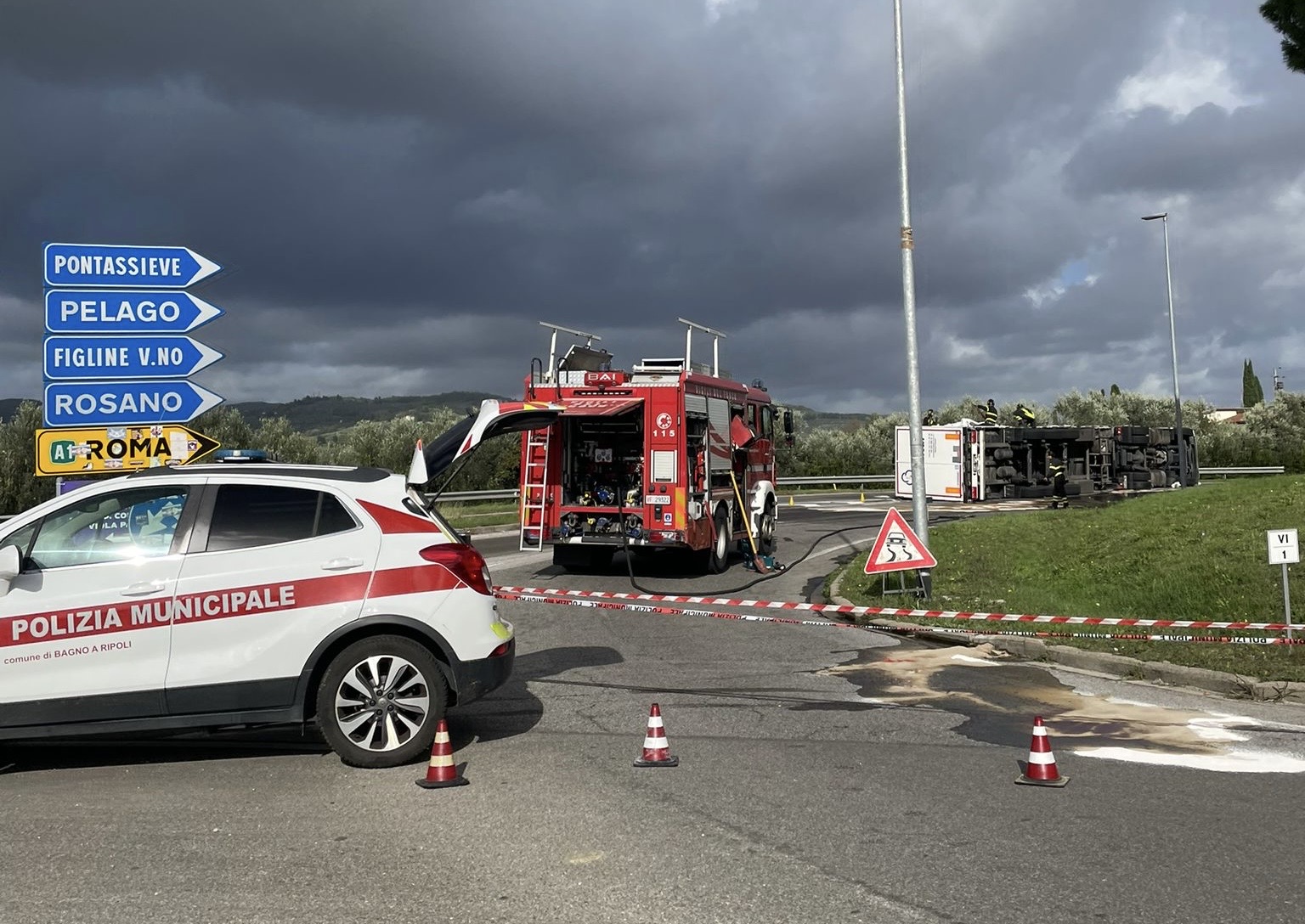 Bagno a Ripoli, autoarticolato ribaltato in mezzo alla carreggiata