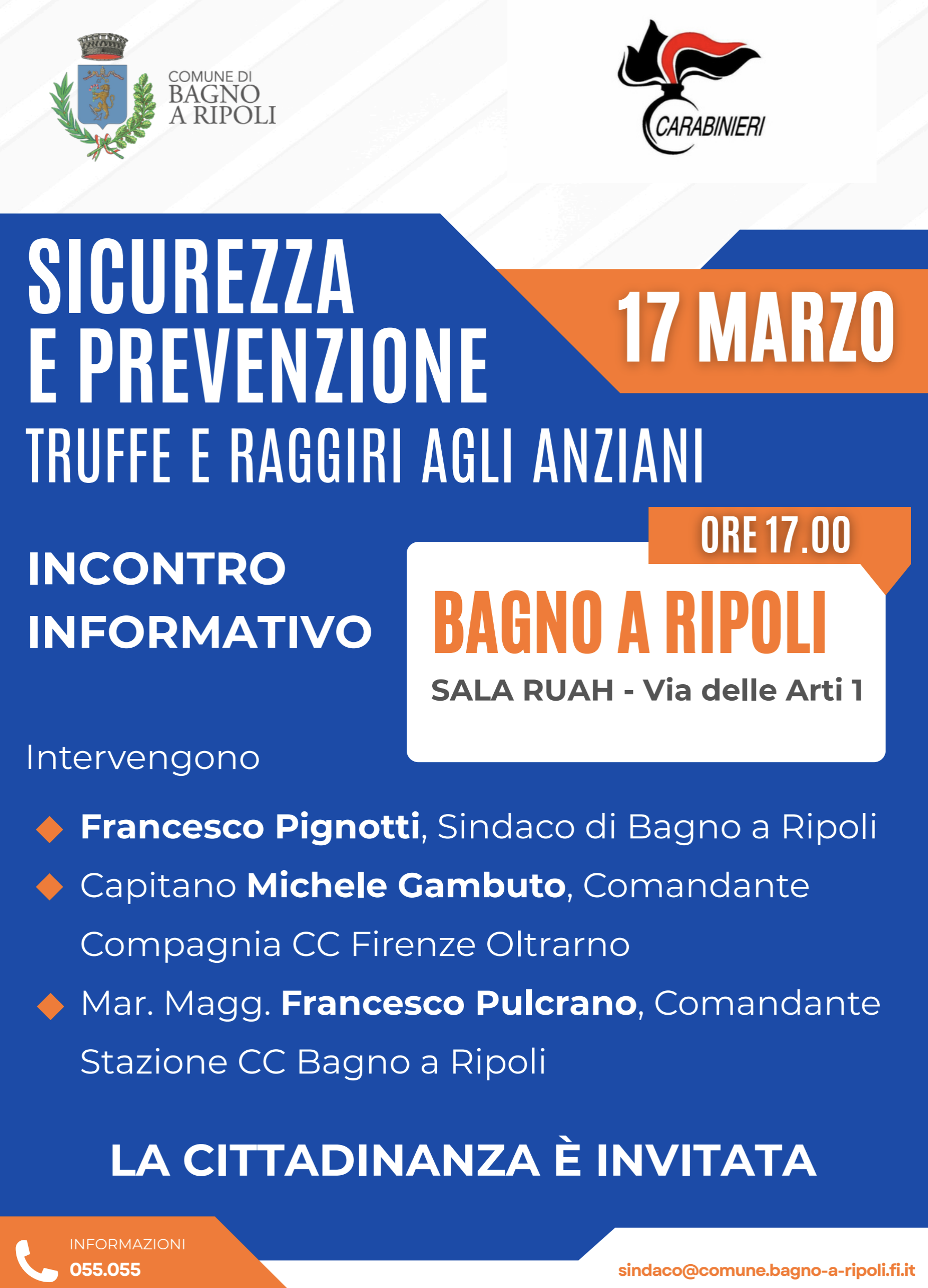 Un incontro informativo per prevenire e contrastare le truffe e i raggiri agli anziani. È quello in programma martedì 17 marzo alle ore 17.00 alla Sala Ruah a Bagno a Ripoli (via delle Arti 1). Tutta la cittadinanza è invitata a partecipare all’iniziativa, promossa dall’amministrazione comunale e dai Carabinieri. Saranno presenti il sindaco di Bagno a Ripoli Francesco Pignotti, il Comandante della Compagnia CC Firenze Oltrarno, Capitano Michele Gambuto, e il Comandante della Stazione CC di Bagno a Ripoli, Maresciallo Maggiore Francesco Pulcrano.