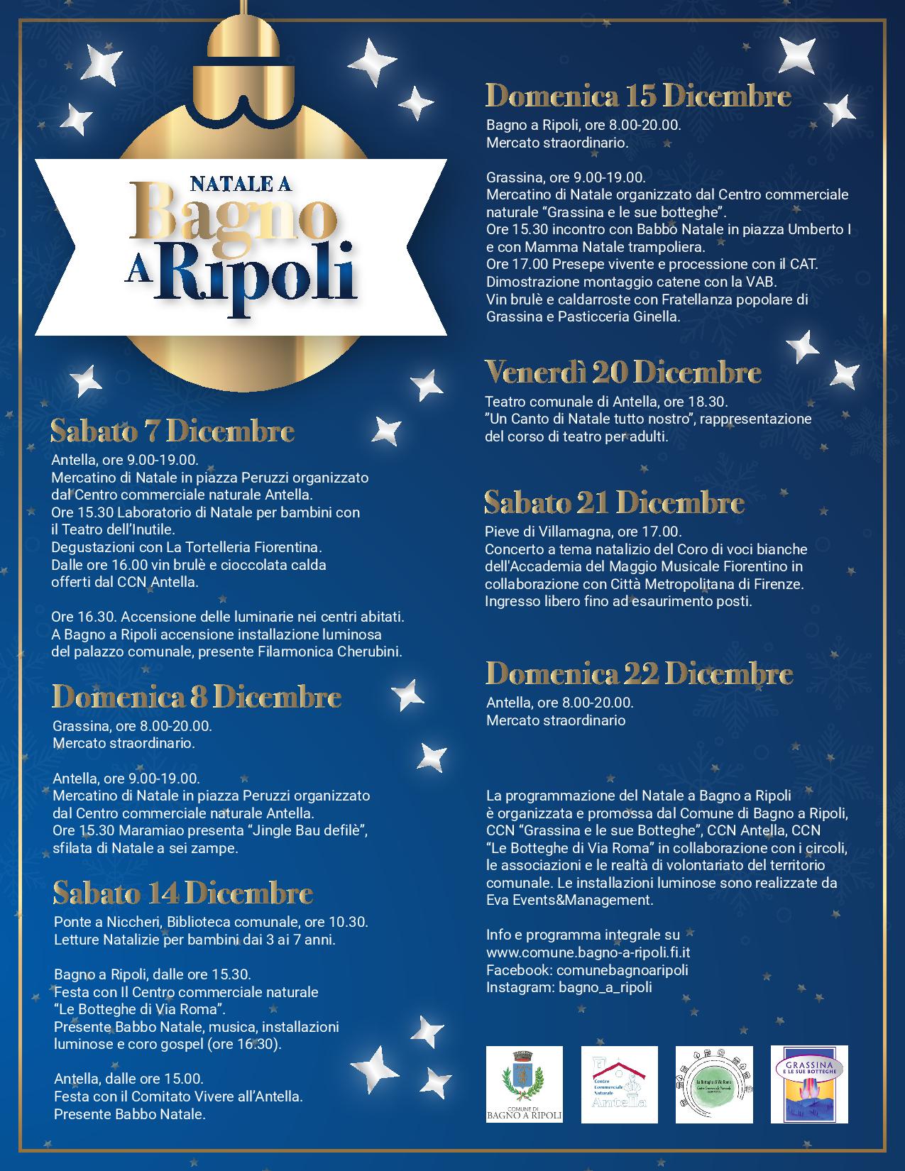 La programmazione del Natale a Bagno a Ripoli è organizzata e promossa dal Comune di Bagno a Ripoli, CCN “Grassina e le sue Botteghe”, CCN Antella, CCN “Le Botteghe di Via Roma” in collaborazione con i circoli, le associazioni e le realtà di volontariato del territorio comunale.
