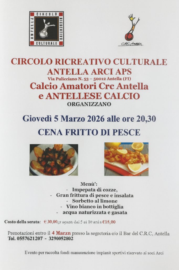 Questa serie di iniziative gastronomiche rientrano nella collaborazione proficua avviata tra il CRC Antella e l’Antellese Calcio, con l’intento di promuovere socialità all’interno della struttura e del paese. Per questo è importante sostenere due realtà che valorizzano il tessuto sociale, sportivo ed economico della frazione.  Prenotazioni entro mercoledì 4 Marzo presso la segreteria del CRC Antella o chiamando lo 055621207 / 3290052802.