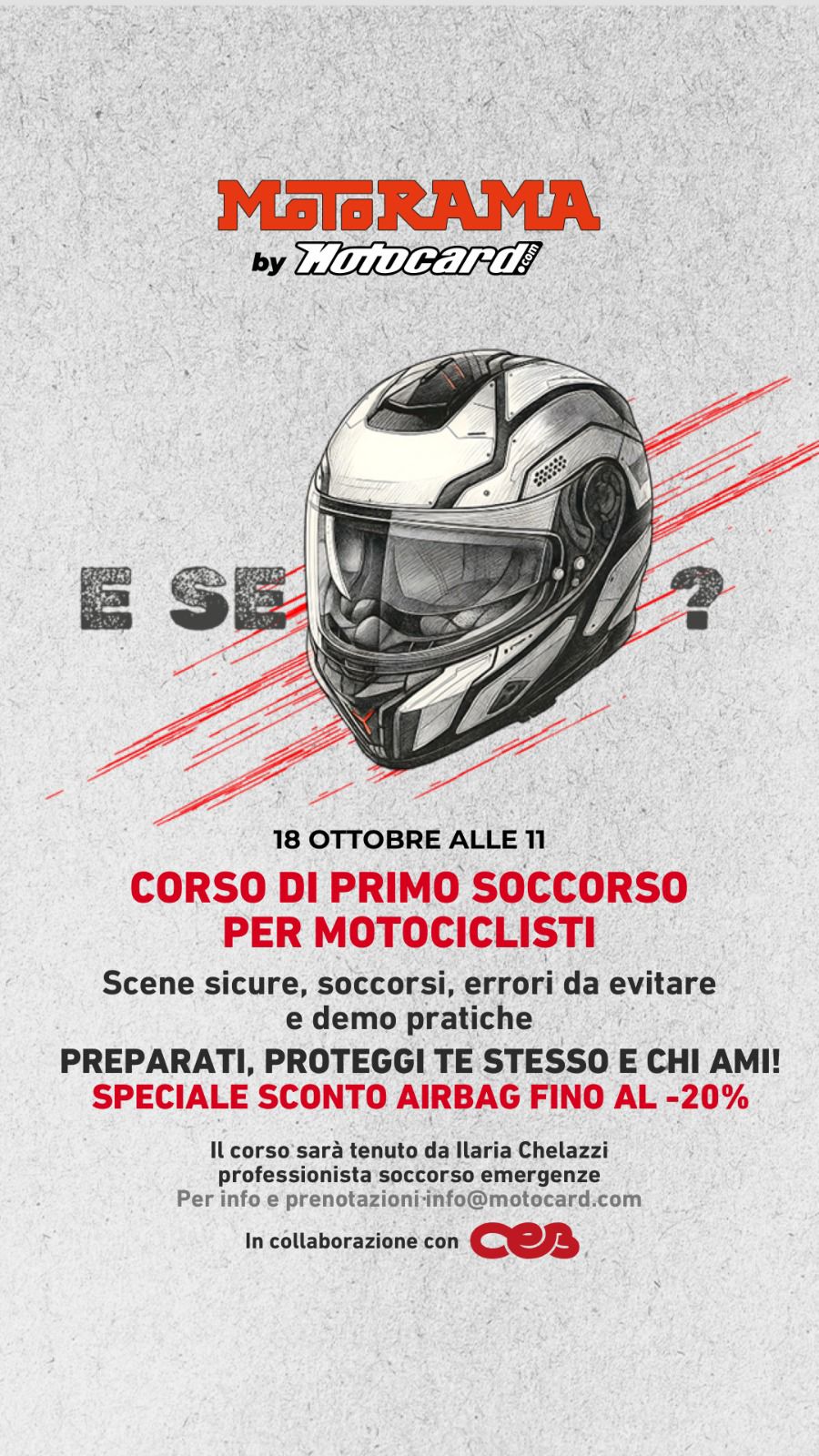 Conoscere la domanda è fondamentale per salvare se stessi ed altre vite, ecco perchè informare e promuovere una corretta prevenzione conoscitiva diventa qualcosa di imprescindibile per vivere la strada e la propria passione al meglio. L’occasione, pertanto, è da non perdere: sabato 18 ottobre, alle ore 11:00, si terrà un corso di primo soccorso per motociclisti. Sarà gratuito e la location scelta è il noto negozio fiorentino di articoli motociclistici MOTORAMA by Motocard, in Via Mannelli 79.