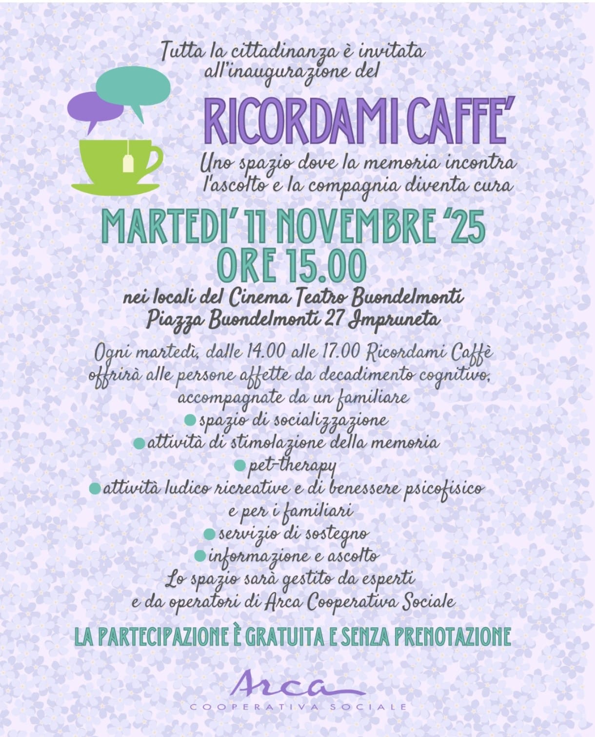 Martedì 11 Novembre, presso i locali del Cinema Teatro Buondelmonti di Impruneta, verrà inaugurato “Ricordami Caffè”, un nuovo spazio di incontro e sostegno dedicato alle persone affette da decadimento cognitivo, accompagnate da un familiare.