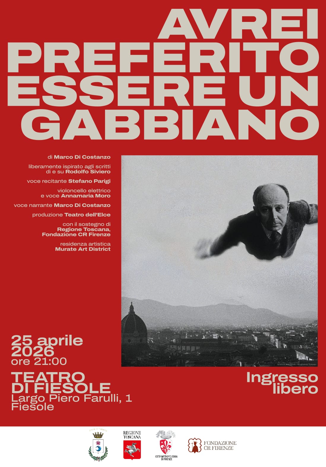 Le celebrazioni si concluderanno alle ore 21:00 al Teatro di Fiesole con lo spettacolo “Avrei preferito essere un gabbiano”, a cura del Teatro dell’Elce (ingresso gratuito). L’opera racconta la figura di Siviero, simbolo della difesa dell’arte e dell’identità culturale italiana durante il conflitto.