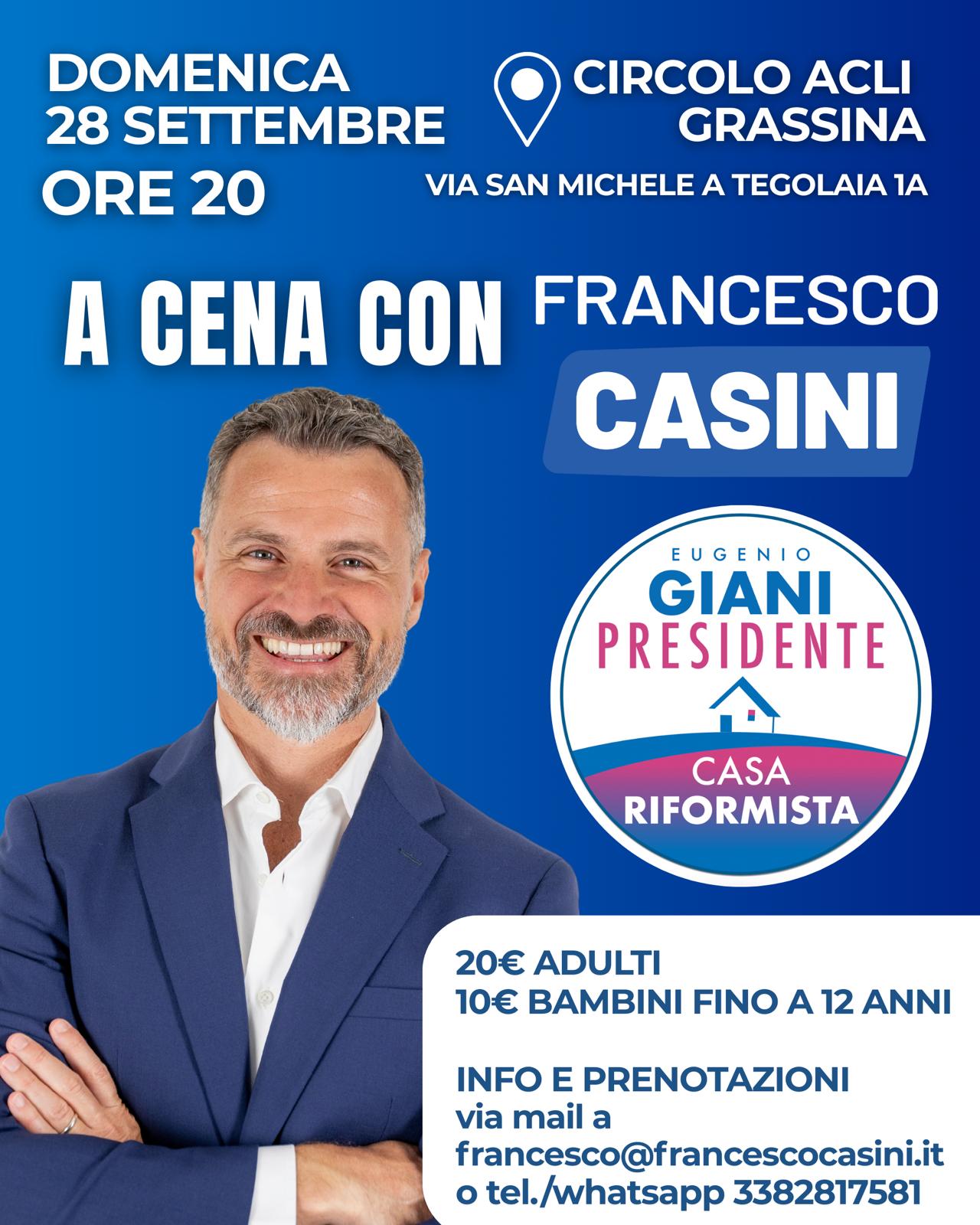 Riparte da Grassina, nel comune di Bagno a Ripoli, il luogo dove è stato sindaco per oltre dieci anni, la campagna elettorale di Francesco Casini, candidato al Consiglio Regionale per la lista Eugenio Giani Presidente – Casa Riformista. Domenica 28 settembre alle ore 20, presso il Circolo ACLI di Grassina (Via San Michele a Tegolaia 1A), si terrà una cena aperta a cittadini, amici e sostenitori: “un momento conviviale, ma soprattutto un’occasione di incontro, dialogo e confronto sui temi che riguardano il futuro della Toscana.”