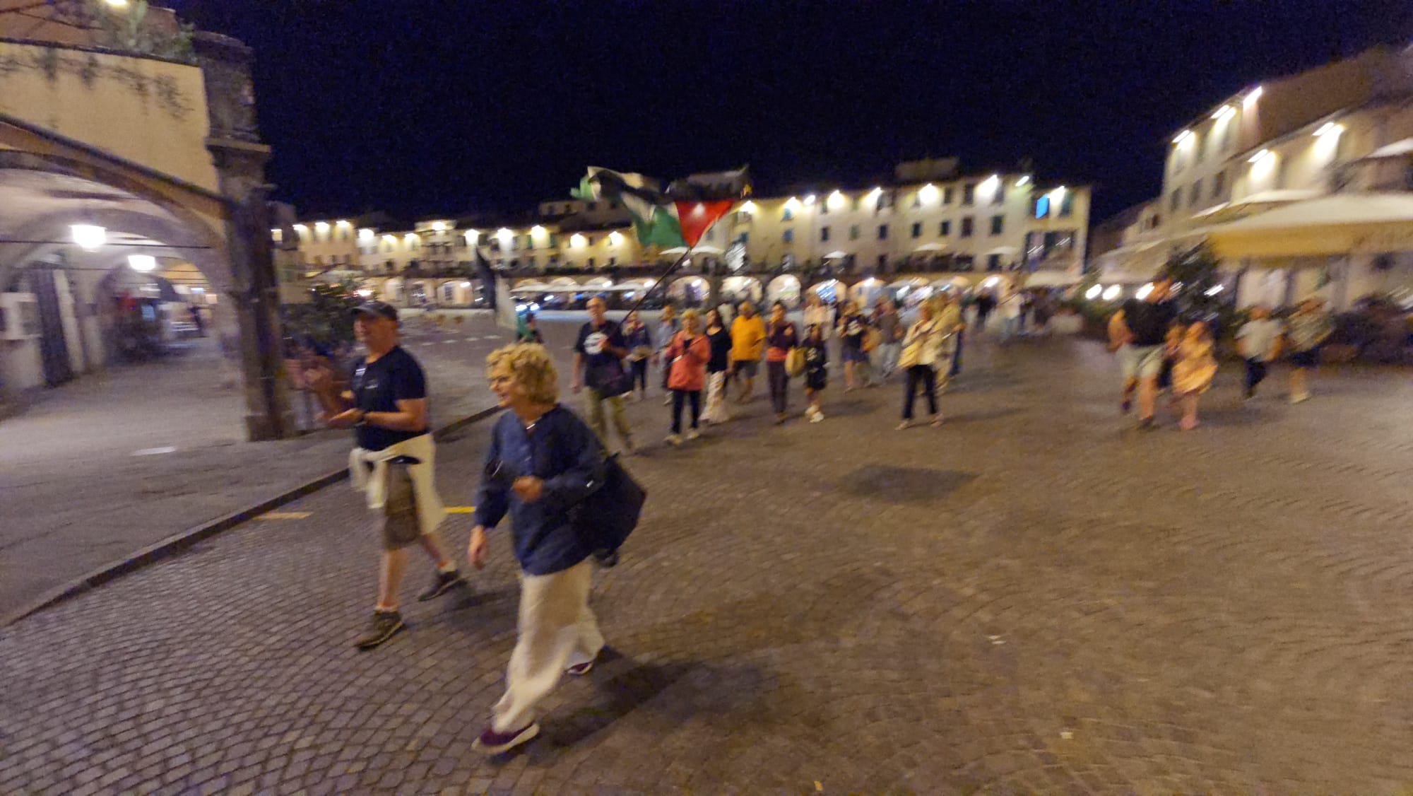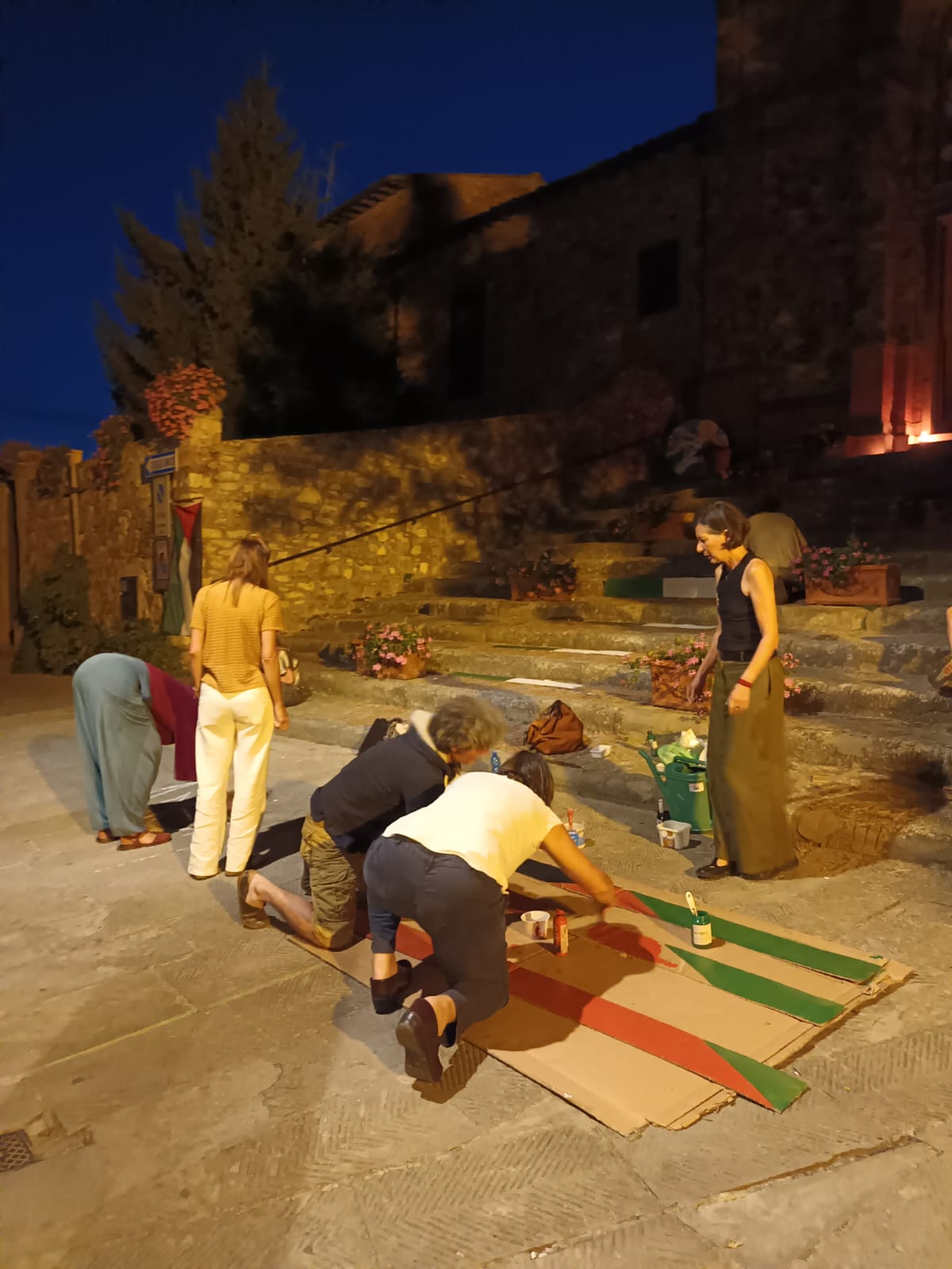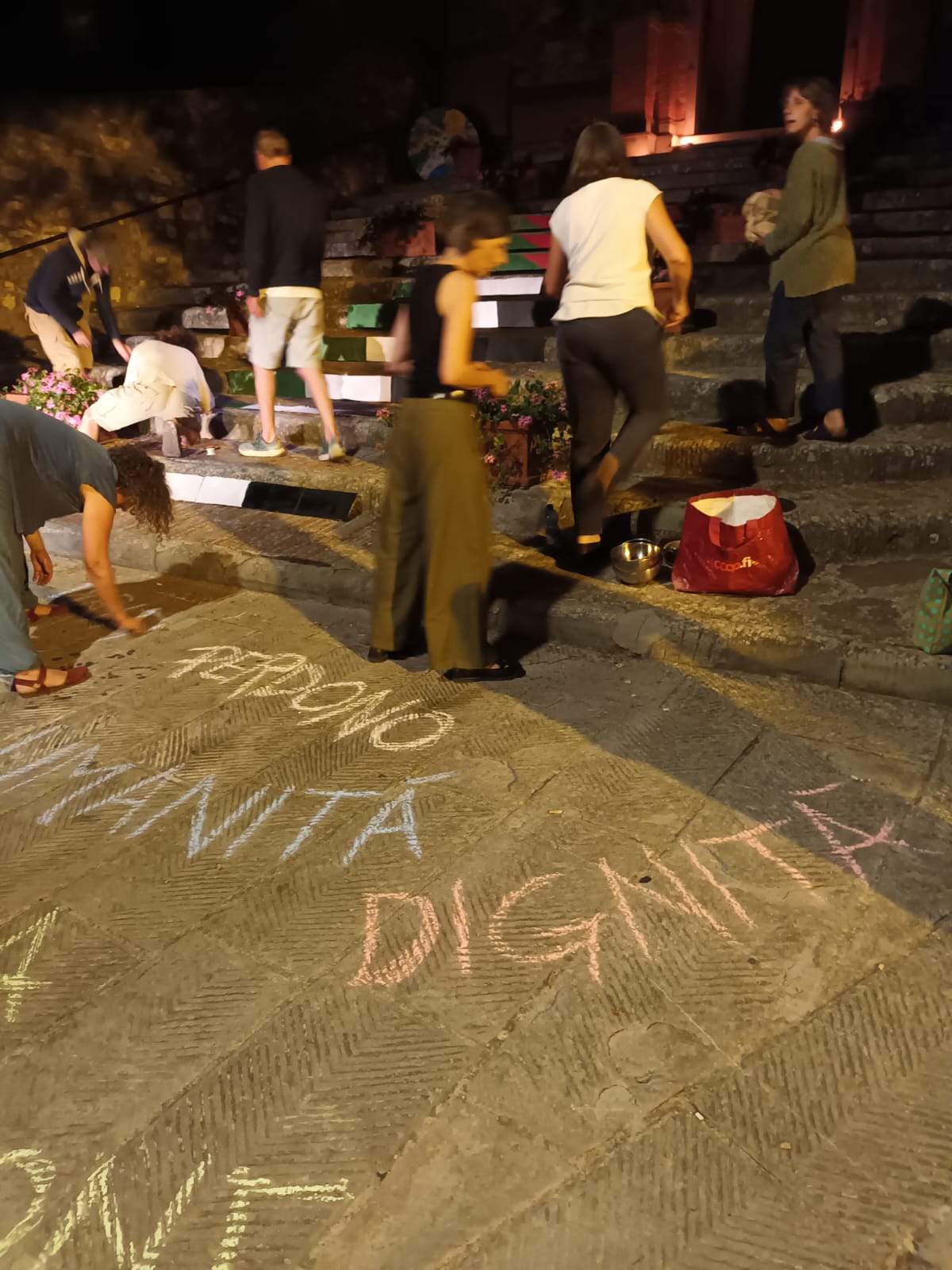 Anche il Comune di Greve in Chianti ha partecipato, nella serata di ieri, domenica 27 luglio, alla simbolica campagna Gaza muore di fame: disertiamo il silenzio. Come accaduto a Firenze, anche in terra chiantigiana, cittadini e Istituzioni sono scesi in piazza per fare rumore contro la strage in atto a Gaza, dove giornalmente vengono uccisi civili in attesa di aiuti umanitari. “Armati” di fischi, tamburi ed altri oggetti rumorosi, una schiera di partecipanti hanno camminato per le vie dei centri storici di Greve in Chianti e Panzano: qui, nella frazione panzanese, sono state decorate le scalinate della Chiesa con una serie di coperture riportanti i colori della bandiera palestinese e sono stati scritti, in terra, con gessetti lavabili, termini significativi quali umanità, dignità, perdono.