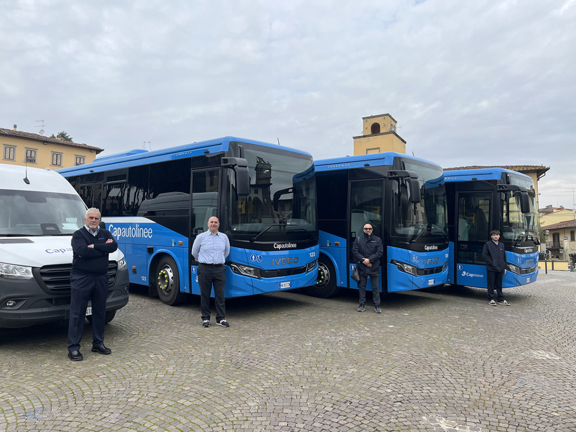 Sono stati presentati ieri, mercoledì 4 marzo 2026, i quattro nuovi mezzi acquistati da CAP Scarl – società del gruppo CAP Soc. Cooperativa di Prato, che dal settembre 2025 gestisce in subappalto, per conto di Autolinee Toscane, il servizio di trasporto scolastico nel Comune di Impruneta – per il completo rinnovo della flotta dedicata agli studenti. I nuovi autobus sono tre Iveco Crossway extraurbani da 10,5 metri e un minibus Mercedes Sprinter da 8 metri. Tutti i veicoli sono omologati Euro 6, garantendo così basse emissioni e un impatto ambientale ridotto.
