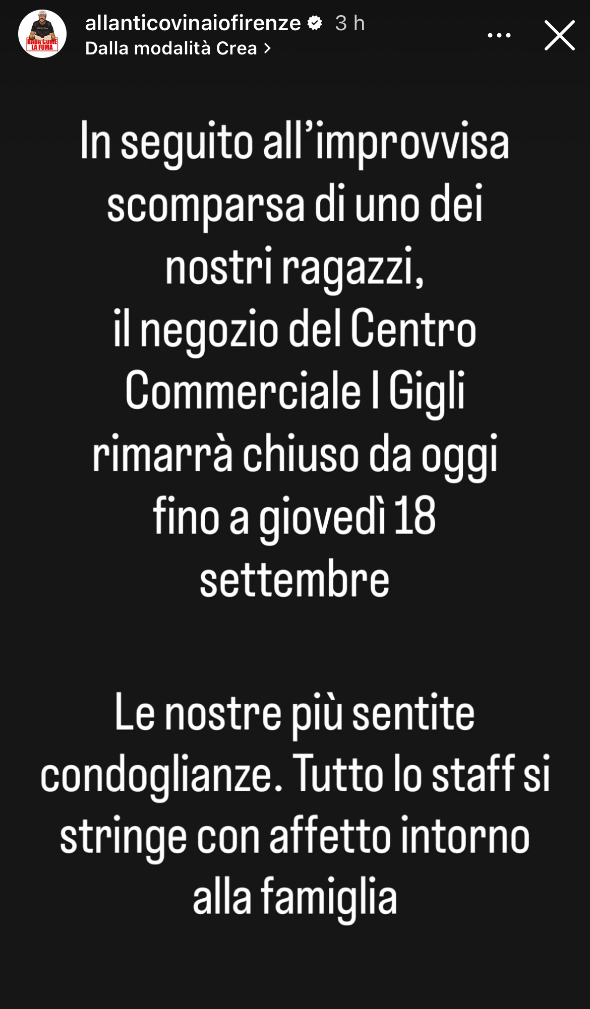 Secondo le prime ricostruzioni, la moto Yamaha XJ guidata da Tommaso ha impattato un mezzo pesante causando uno scontro violento e fatale. Nonostante l’immediato intervento dei soccorsi, il giovane è deceduto. Tommaso lavorava all’Antico Vinaio, il noto locale diventato famoso nel mondo per le sue schiacciate e più precisamente era operativo nella bottega che si trova interna ai Gigli: per questo, come si legge sui canali social di Antico Vinaio, il punto vendita AV del centro commerciale, scosso per il tragico avvenimento, rimarrà chiuso fino a giovedì 18 settembre.