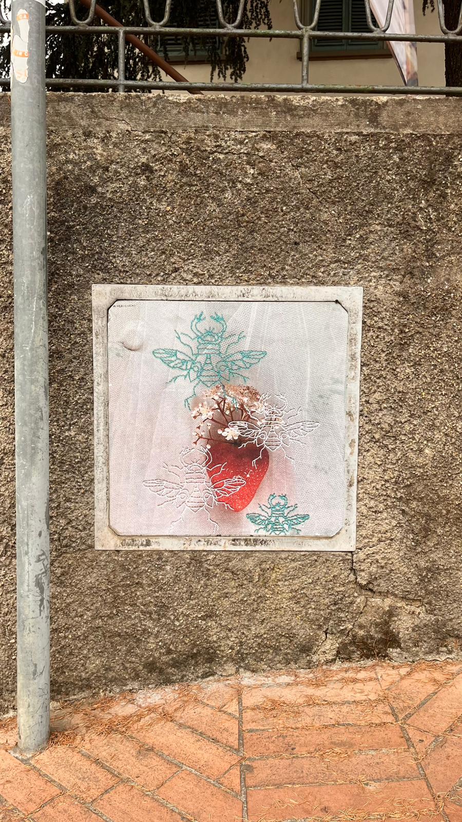 Meri Ciuchi: Anghiari (IT) 1970. Vive a Sansepolcro. 1989/1990 Diploma di maturità d’Arte Applicata – Tessitura e stampa -Sansepolcro (AR). 1994 Diploma di Laurea Accademia di Belle Arti /Scenografia – Perugia. Artista eclettica nella scelta delle tecniche, esperimenta l’arte nelle sue varie forme: dall’esperienza Teatrale(1994-97) passa alla Pittura per approdare alla Fotografia e attualmente alla realizzazione di Installazioni ed Arte del ricamo / Embroidery Art ed da alcuni anni si dedica anche alla Street Art nello specifico alla Poster Art con affissioni in strada. I suoi progetti invitano a costanti cambiamenti di percezione visuale ed emotiva. In quasi tutti i suoi ultimi lavori sono presenti insetti che nel percorso creativo si propongono in una sorta di “similitudine con l’io”- rappresentazione simbolica. Usa il ricamo in quanto segno indelebile, non può essere rimosso del tutto, modifica la superficie, così com’è il personale vissuto. Predilige la contaminazione tra tecniche moderne come la fotografia ed il cucito metodo di decorazione antico e popolare.
