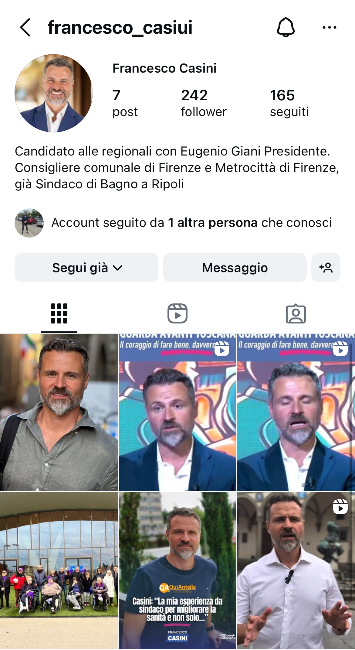 Un profilo che, evidentemente, cerca di sfruttare anche la piena attività sui canali social di Francesco Casini, impegnato in campagna elettorale e per questo giornalmente presente su Instagram. Attenzione, però, non cadete in nessuna possibile truffa. Ecco il messaggio diffuso dal vero Casini che raccomanda massima attenzione e conferma la truffa in corso: