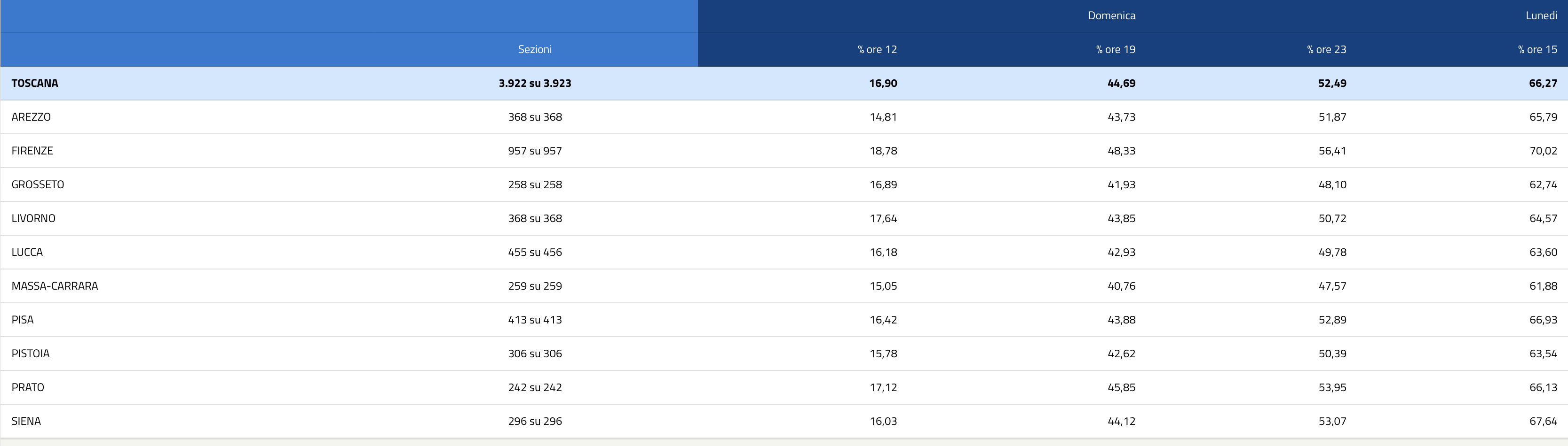 Alle ore 15:00, in Italia, l’affluenza definitiva alle urne è del 58,91%: la Toscana rimane la seconda Regione con un 66,27% dietro all’Emilia Romagna, 66,74%.  Delle province toscane, l’affluenza maggiore si registra a Firenze con un 70,02%: unica provincia a superare la soglia del 70%. Seguono Siena, Pisa, Prato, Arezzo, Livorno, Lucca, Pistoia, Grosseto e Massa Carrara.