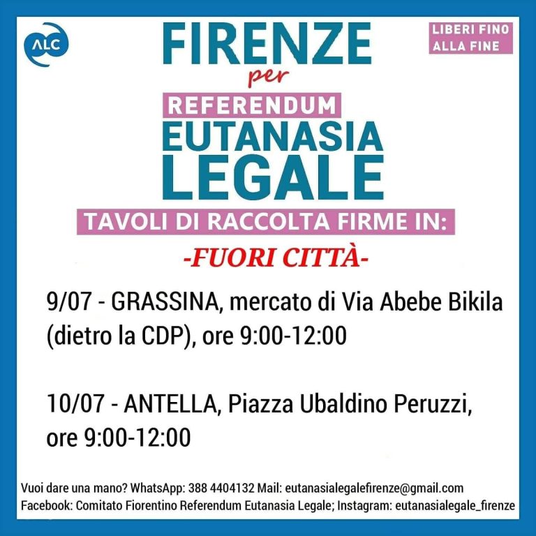 I primi banchini si terranno venerdi 9 luglio a Grassina e sabato 10 luglio ad Antella  alla presenza dei consiglieri comunali ed assessori che hanno dato la propria disponibilità ad autenticare le firme tra i quali, per il momento, vi sono già i consiglieri comunali Andrea Bencini (anche referente territoriale del Comitato promotore), Patrizia Mondini e Sandra Baragli, gli assessori Francesco Pignotti e Francesca Cellini.  Per qualsiasi approfondimento o informazione è a disposizione il sito internet del Comitato Promotore https://referendum.eutanasialegale.it/