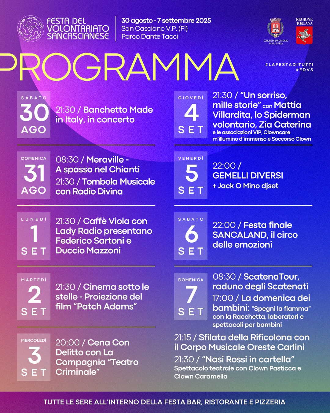 Un festival che vuole sorridere, esprimere concretamente atti di solidarietà a favore dei più deboli e diffondere i valori della diversità e della resilienza come fonte di ricchezza umana e sociale, come strumento di aggregazione e condivisione, al fianco di circa 300 volontari e volontarie provenienti da oltre venti associazioni del territorio sancascianese. Da sabato 30 agosto a domenica 7 settembre prende vita negli spazi del Parco Dante Tacci, a due passi dal centro storico del capoluogo, la Festa del Volontariato Sancascianese, uno degli eventi di carattere umanitario più rilevanti della Toscana che mette insieme energie, risorse, cultura della responsabilità e impegno civico di tutte le associazioni di volontariato, Onlus e NoProfit, del territorio. Al centro della manifestazione, che si classifica al primo posto in Italia per il numero di associazioni aderenti, è il tema del sorriso e della clownterapia.