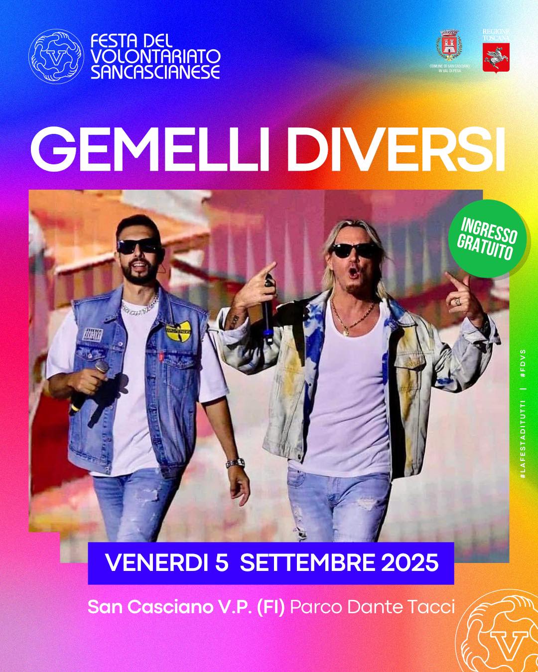 Ecco il programma della festa del volontariato sancascianese: special guest saranno i Gemelli Diversi, attesi il 5 settembre 2025