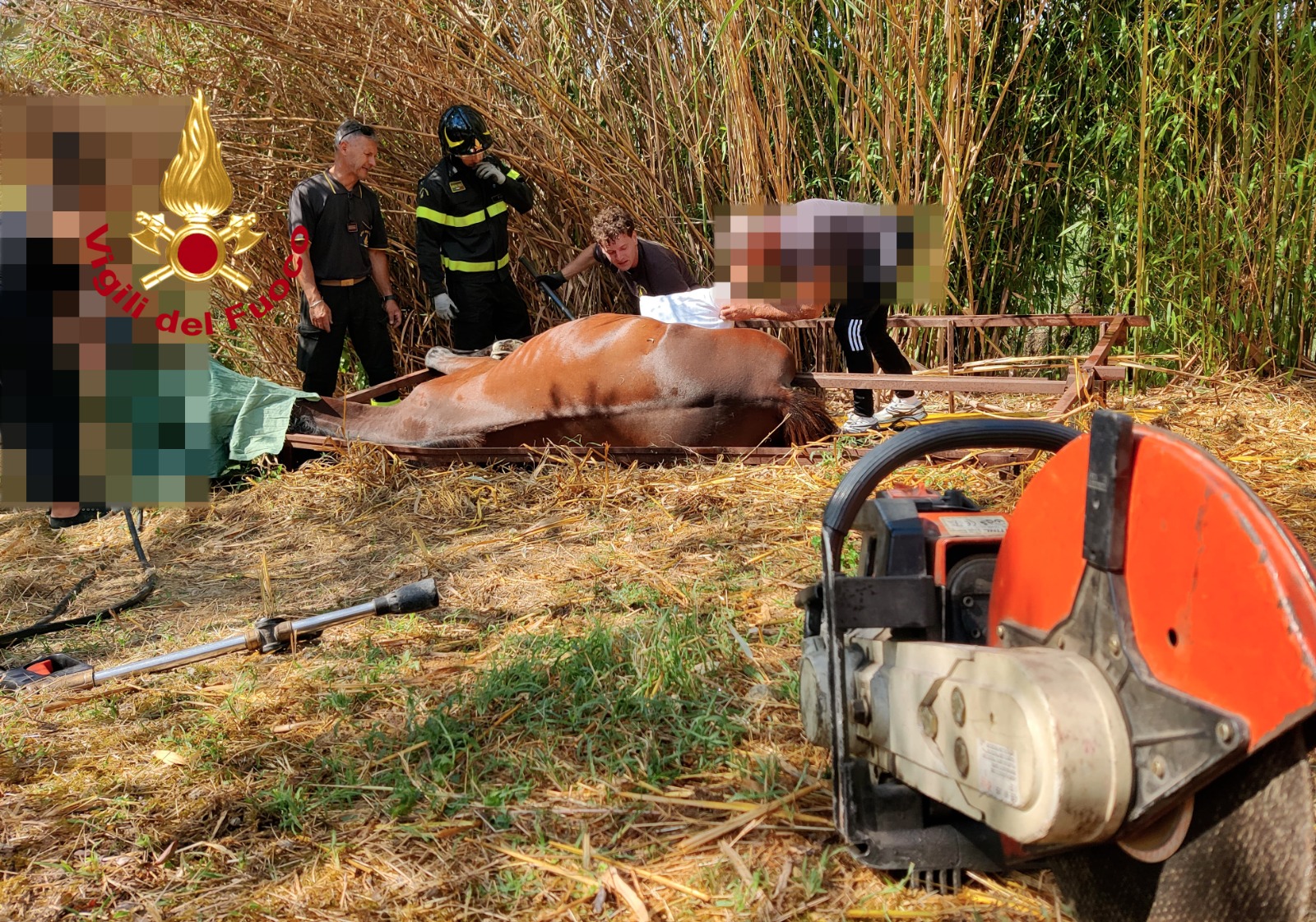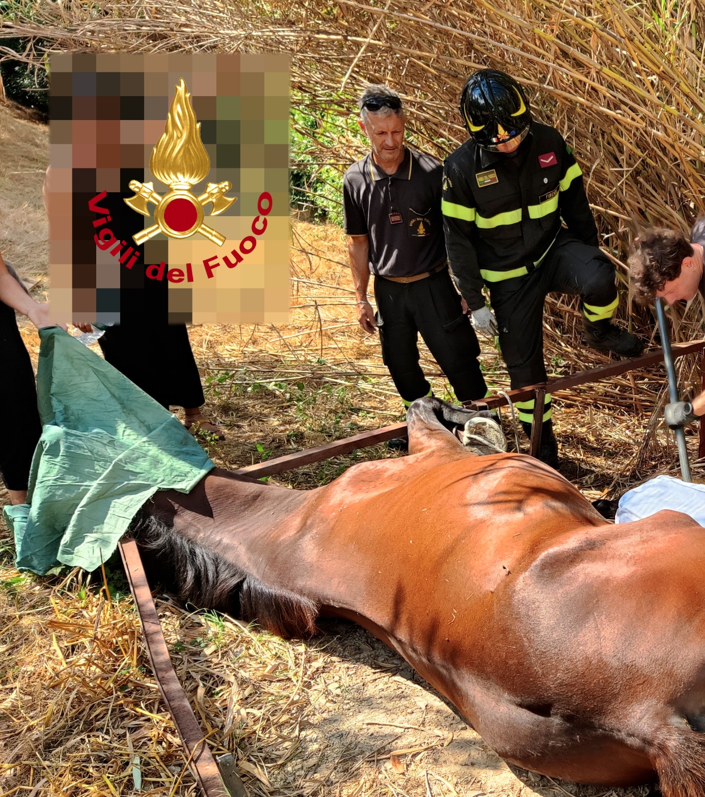 I Vigili del fuoco giunti sul posto hanno atteso l’arrivo del veterinario che ha addormentato il cavallo, per poi procedere con la mototroncatrice al taglio di alcuni profili di ferro dove il quadrupede si è incastrato essendo scivolati via dei tavoloni di legno. Al termine dei tagli e con la rimozione dei ferri l’animale è stato liberato e riposizionato per poi essere risvegliato e rimesso in piedi. Intervento terminato alle ore 13:00.