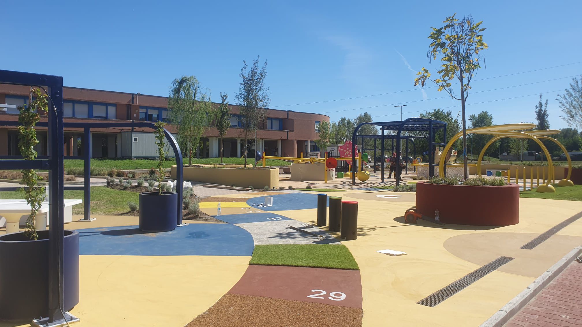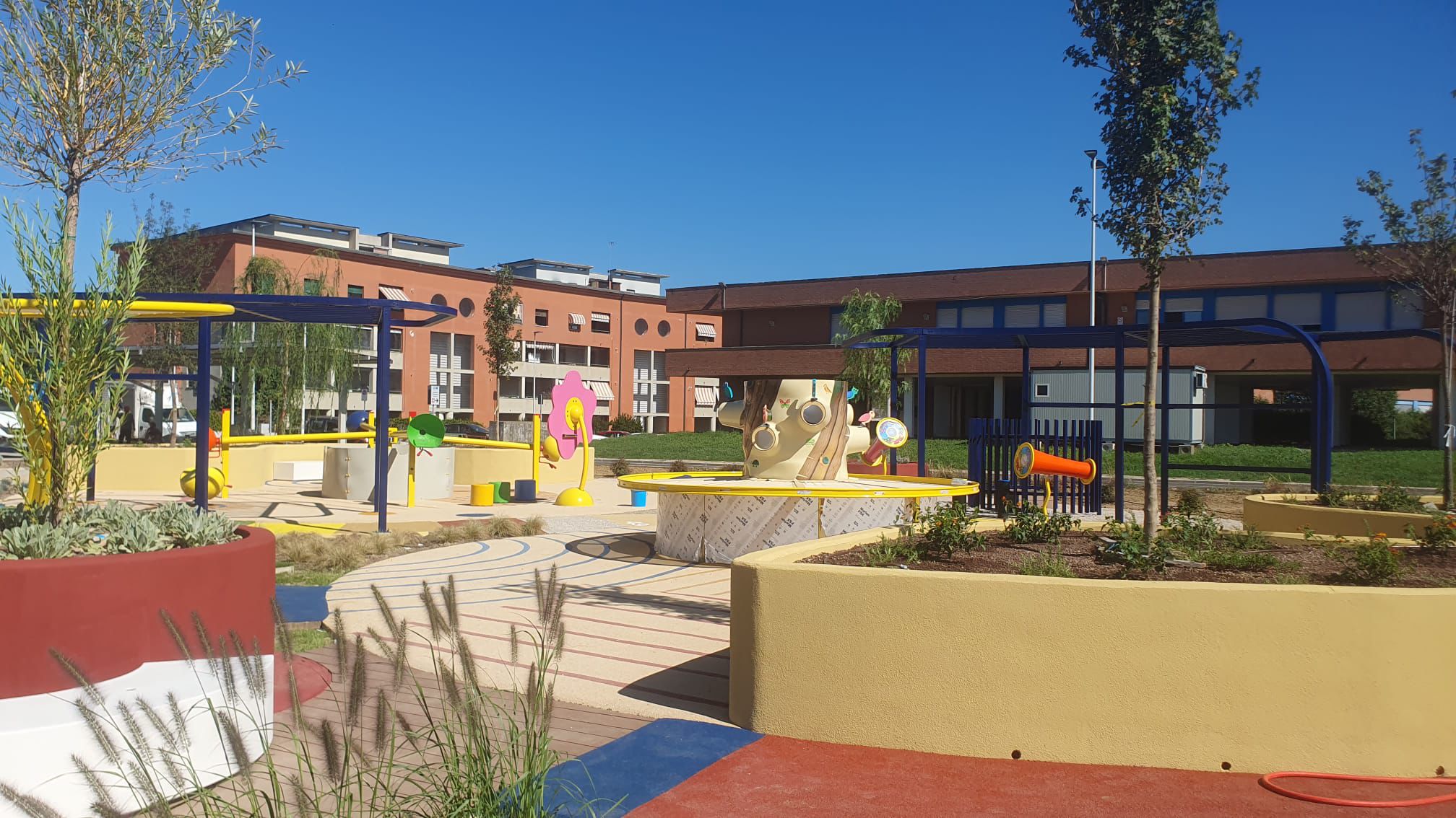Il parco è stato idealmente diviso in tre zone: c’è l’area quieta, nei pressi delle abitazioni, dove sorgono il frutteto, gli orti e l’area gioco; l’area della piazza fra il parcheggio ed il centro polivalente, in cui sono ubicati gli spazi per tutte le età (basket, ping-pong, gioco d’acqua) alternate ad area per la sosta; e l’area gioco inclusiva, con strutture ludiche per dondolamento, equilibrio, scivolamento, rotazione, aree verdi e aree per il picnic. Elemento unificante del progetto è un grande ‘gioco dell’oca’ che si svilupperà in tutto il parco con ogni casella che avrà una pavimentazione diversa dalle altre: sarà possibile giocare proprio come nel classico gioco da tavolo.
