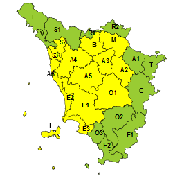 In corso (fino alle 18 di oggi) un altro codice giallo, sempre per rischio idrogeologico-idraulico del reticolo minore e temporali forti, per le zone nord ovest. Oggi ci sono stati temporali sparsi, anche di forte intensità, inizialmente sulle zone di nord ovest, in graduale trasferimento nel pomeriggio al resto delle zone centro settentrionali, in particolare quelle interne. Fenomeni previsti in esaurimento in serata ma in ripresa dalle primissime ore di domani, domenica, con temporali localmente anche di forte intensità, inizialmente sul nord e parte del centro, per poi trasferirsi nel pomeriggio alle zone interne centromeridionali. Possibilità di forti colpi di vento e locali grandinate.